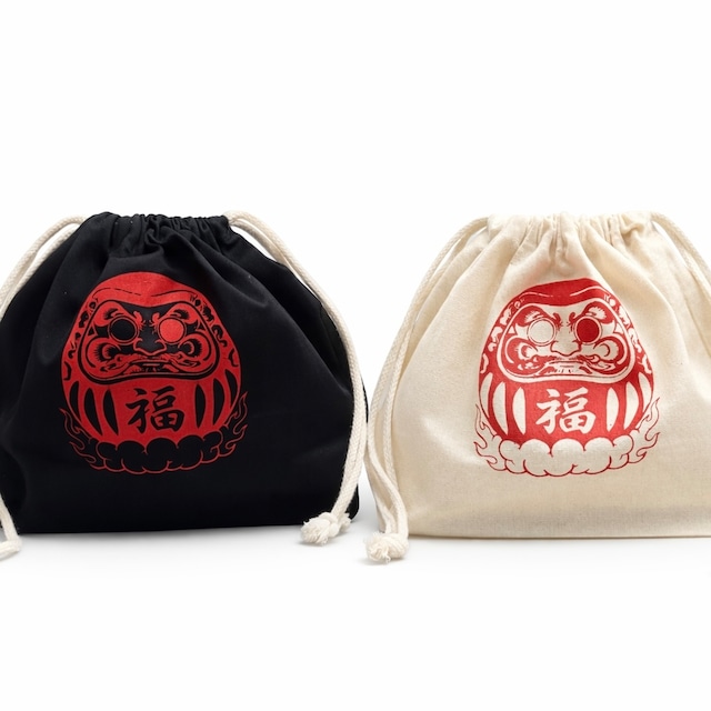 【だるま】手刷り 薄手 巾着バッグ シルクスクリーン 生成り×赤
